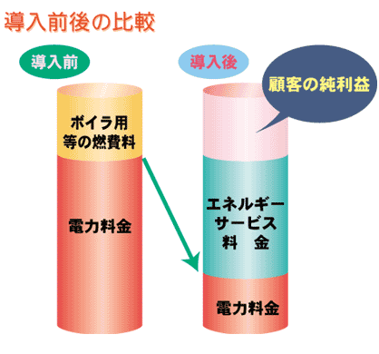 コージェネシステム導入によるコストダウンとCO2削減対策等「五つの効果」を御検討されているユーザーに対して、中・長期的にエネルギーの削減額によって省エネ投資をまかなえる様に企業や自治体の省エネ計画の立案から設備の施工、維持を一括して請け負う事業です。